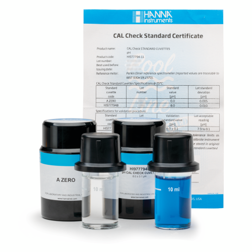 HI977xx-11 là bộ tiêu chuẩn hiệu chuẩn chất lượng cao cho phép người dùng xác nhận và hiệu chuẩn máy quang kế cầm tay Hanna HI977xx tương ứng. HI977xx-11 bao gồm một cuvet “A” để đưa máy về 0 và một cuvet “B” được sử dụng để xác nhận hoặc hiệu chuẩn. Giá trị dự kiến của dung dịch chuẩn “B” ở @25℃ sẽ được đề cập trong Giấy Chứng Nhận Phân Tích đi kèm. Bộ dung dịch chuẩn được sản xuất tại nhà máy hiện đại của Hanna với tiêu chuẩn châu Âu, sử dụng hóa chất cấp thuốc thử trong môi trường được kiểm soát nhiệt độ.