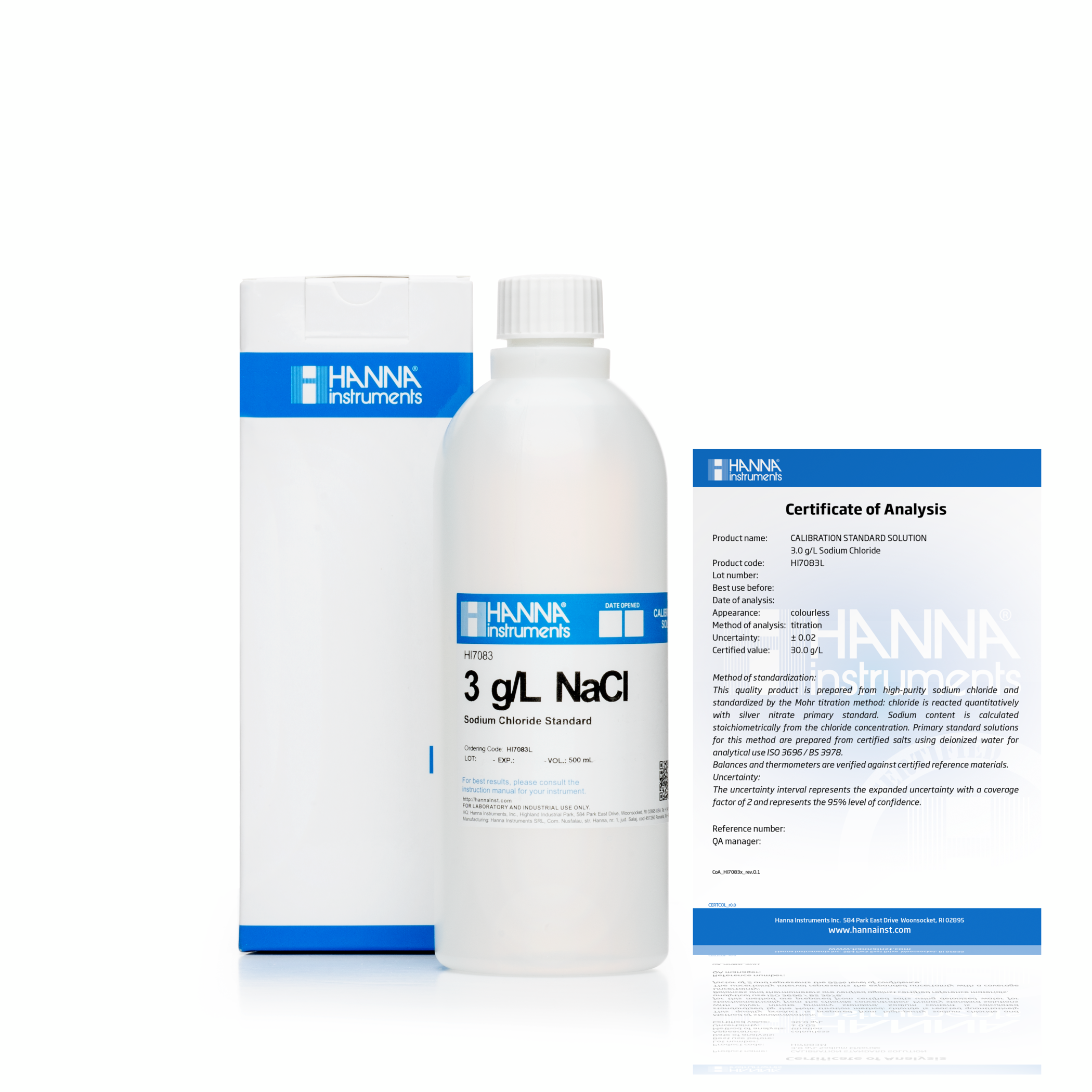 HI7083L là dung dịch chuẩn Natri Clorua 3.0g/L chất lượng cao. Dung dịch đệm hiệu chuẩn Hanna có số lô và ngày hết hạn được đánh dấu rõ ràng trên nhãn và được đóng kín bằng seal chống giả để đảm bảo chất lượng của dung dịch. Dòng đệm chuẩn của Hanna được thiết kế đặc biệt để có thời hạn dài đối với chai chưa mở.
