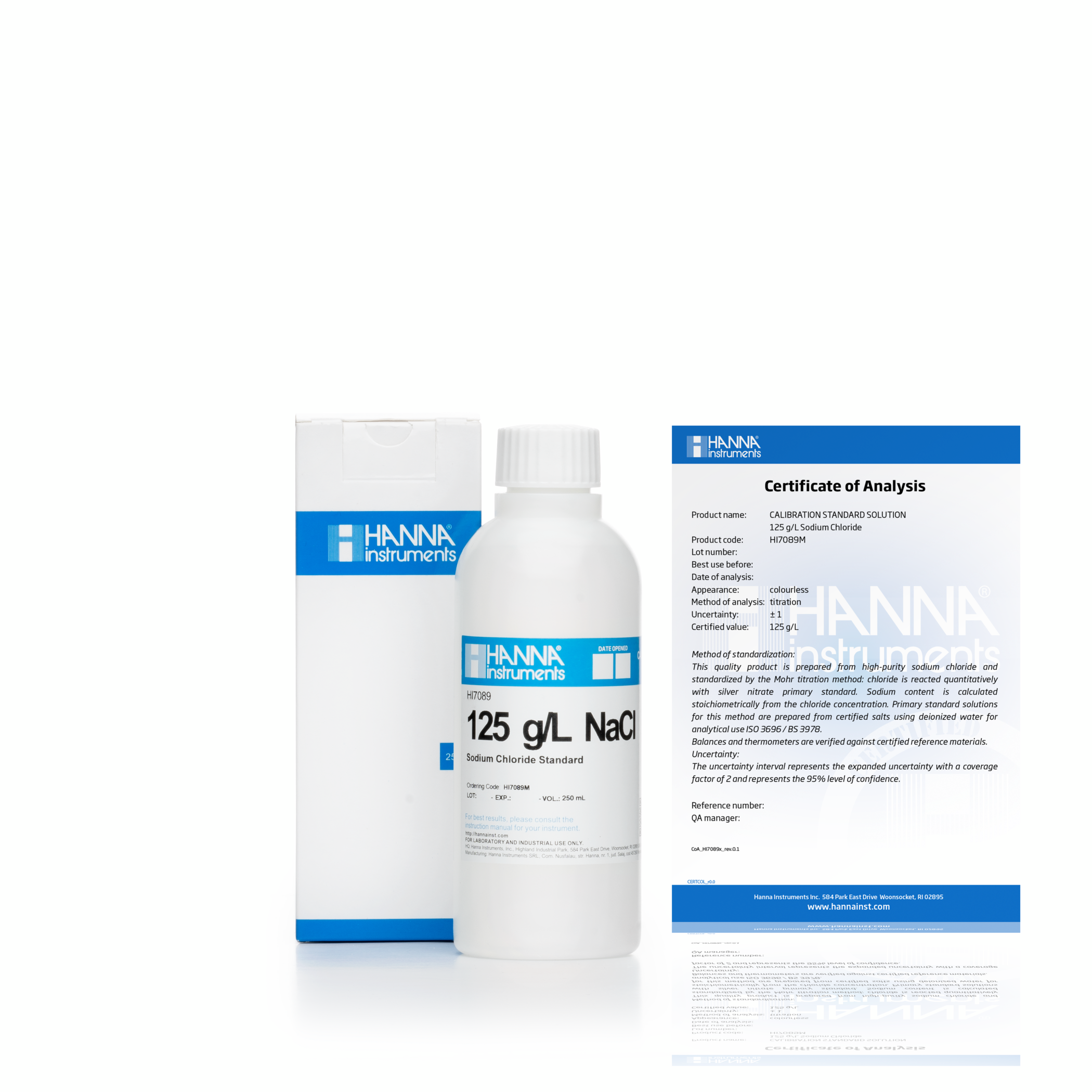 HI7089M là dung dịch chuẩn natri clorua 125g/L chất lượng cao được sản xuất theo tiêu chuẩn ISO 3696 / BS3978 sử dụng muối có độ tinh khiết cao, nước khử ion, cân bằng kiểm tra trọng lượng và thủy tinh loại A trong môi trường được kiểm soát nhiệt độ được theo dõi bằng nhiệt kế được chứng nhận. Các giá trị được báo cáo có thể truy nguyên theo Tài liệu tham khảo tiêu chuẩn (SRM) của NIST.