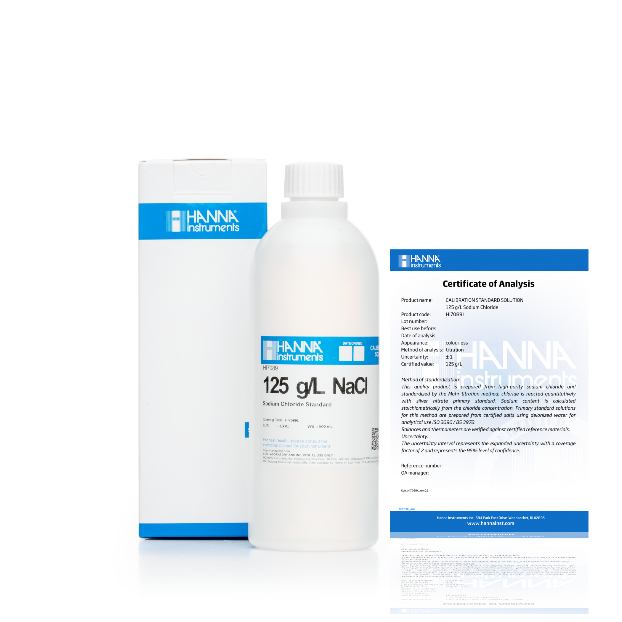 HI7089L là dung dịch chuẩn natri clorua 125g/L chất lượng cao được sản xuất theo tiêu chuẩn ISO 3696 / BS3978 sử dụng muối có độ tinh khiết cao, nước khử ion, cân bằng kiểm tra trọng lượng và thủy tinh loại A trong môi trường được kiểm soát nhiệt độ được theo dõi bằng nhiệt kế được chứng nhận. Các giá trị được báo cáo có thể truy nguyên theo Tài liệu tham khảo tiêu chuẩn (SRM) của NIST.