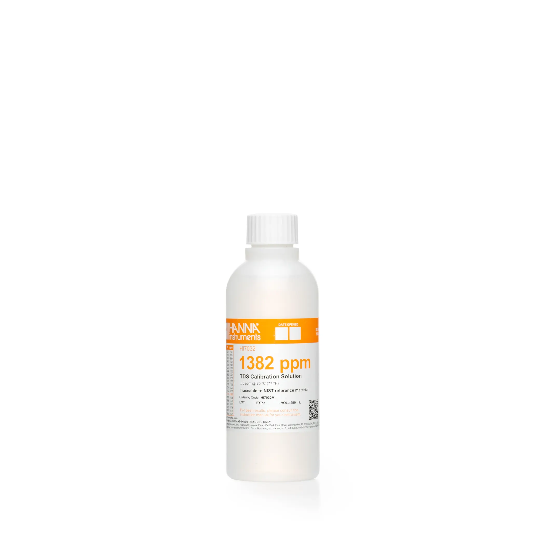 HI7032M là dung dịch hiệu chuẩn Tổng chất rắn hòa tan (TDS) 1382 mg/L (ppm) chất lượng cao. Dung dịch đệm hiệu chuẩn Hanna có số lô và ngày hết hạn được đánh dấu rõ ràng trên nhãn và được đóng kín bằng seal chống giả để đảm bảo chất lượng của dung dịch. Dòng đệm chuẩn của Hanna được thiết kế đặc biệt để có thời hạn dài đối với chai chưa mở.