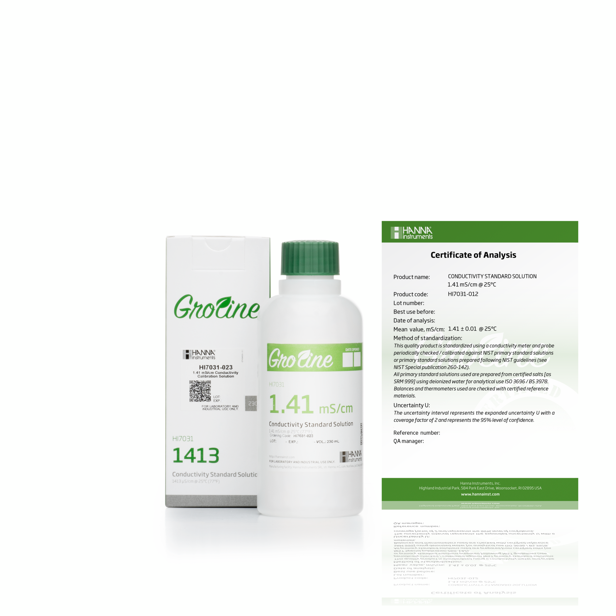Dung dịch hiệu chuẩn độ dẫn 1,413µS/cm chất lượng cao được chuẩn hóa cùng với một máy đo độ dẫn điện đã được hiệu chuẩn với kali clorua NIST SRM 2202 (Chất liệu tham chiếu tiêu chuẩn) trong nước khử ion dùng trong phân tích theo tiêu chuẩn ISO 3696 / BS3978. Các thiết bị khác được sử dụng trong việc chuẩn bị dung dịch bao gồm cân đã được kiểm tra trọng lượng đạt chuẩn, thủy tinh loại A và nhiệt kế đã được chứng nhận.