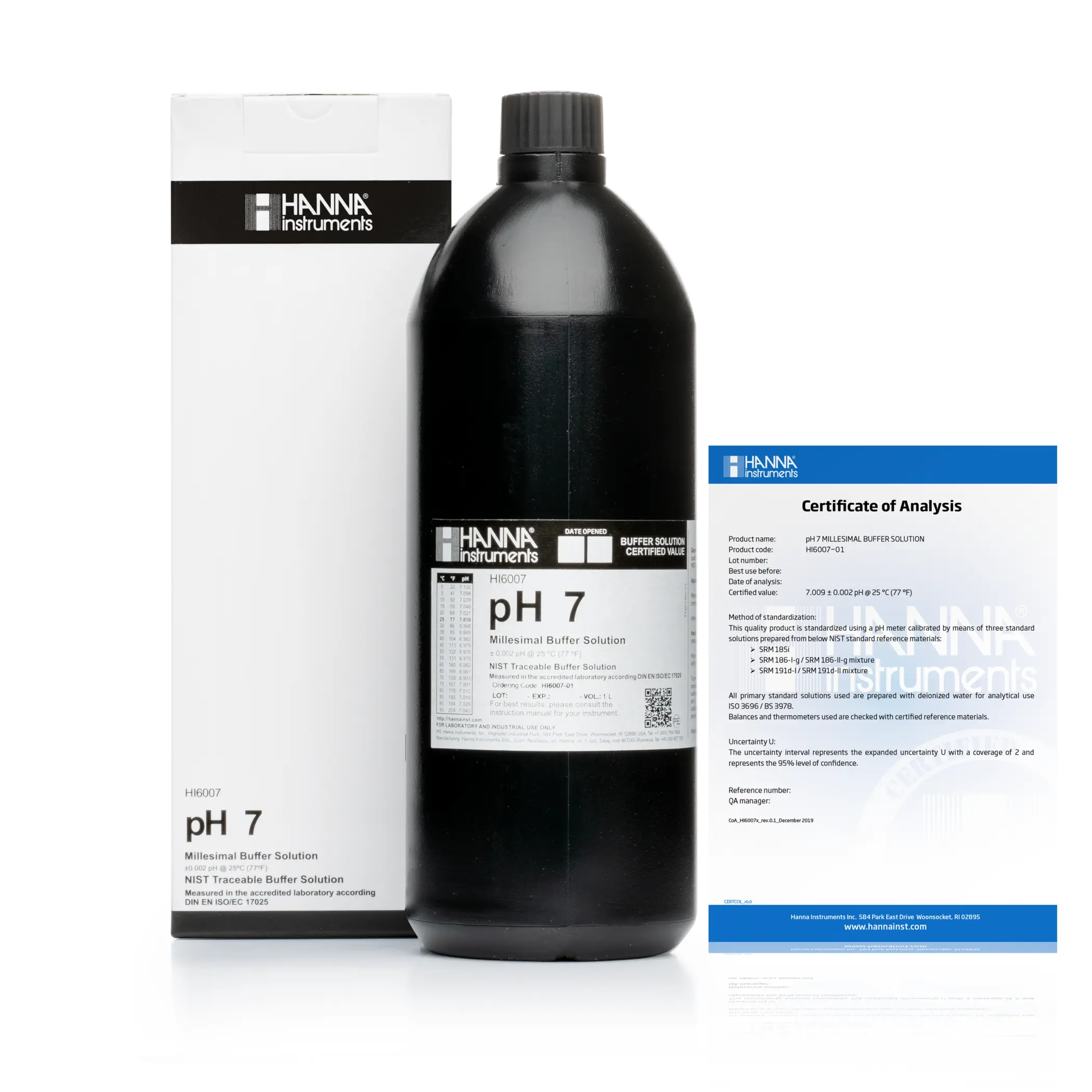 HI6007-01 là dung dịch hiệu chuẩn Millesimal pH7.010 chất lượng cao. Dung dịch đệm hiệu chuẩn Hanna có số lô và ngày hết hạn được đánh dấu rõ ràng trên nhãn và được đóng kín bằng seal chống giả để đảm bảo chất lượng của dung dịch. Dòng đệm chuẩn của Hanna được thiết kế đặc biệt để có thời hạn dài đối với chai chưa mở.
