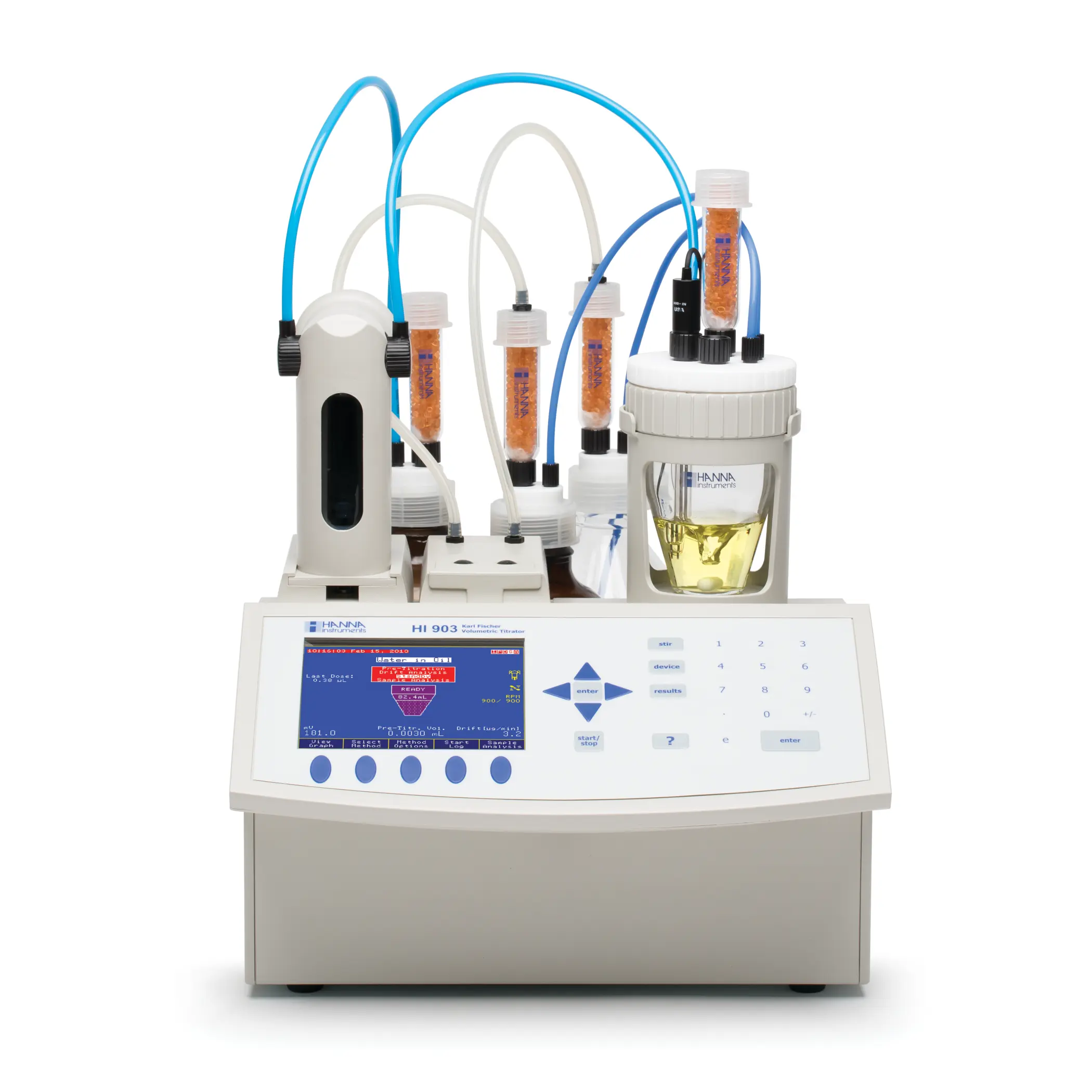 HI903 là dòng máy chuẩn độ Karl Fischer thể tích (volumetric) chuyên dụng của Hanna Instruments, thiết kế để xác định chính xác hàm lượng nước trong mẫu từ 100 ppm đến 100%. Thiết bị tự động thực hiện toàn bộ quy trình chuẩn độ: bơm định lượng, xác định điểm cuối, tính toán kết quả và vẽ đồ thị. Đây là giải pháp tối ưu cho các phòng thí nghiệm kiểm soát chất lượng và nghiên cứu cần độ chính xác cao và tính truy xuất đầy đủ theo tiêu chuẩn GLP, ISO, ASTM, AOAC, EPA, AOCS…